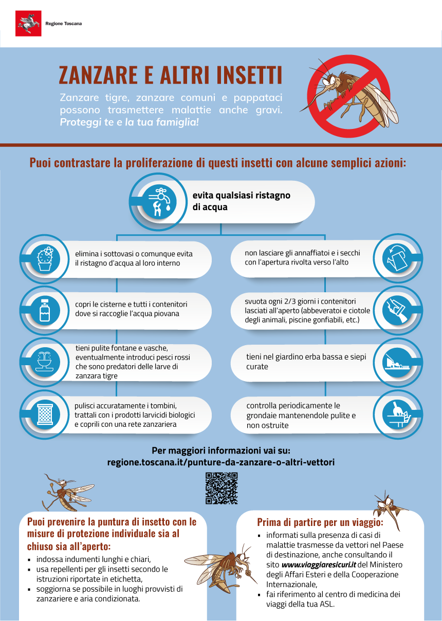 Tutte le informazioni e i riferimenti sulle arbovirosi sono disponibili sul sito ufficiale della Regione Toscana: https://www.regione.toscana.it/-/punture-da-zanzare-o-altri-vettori