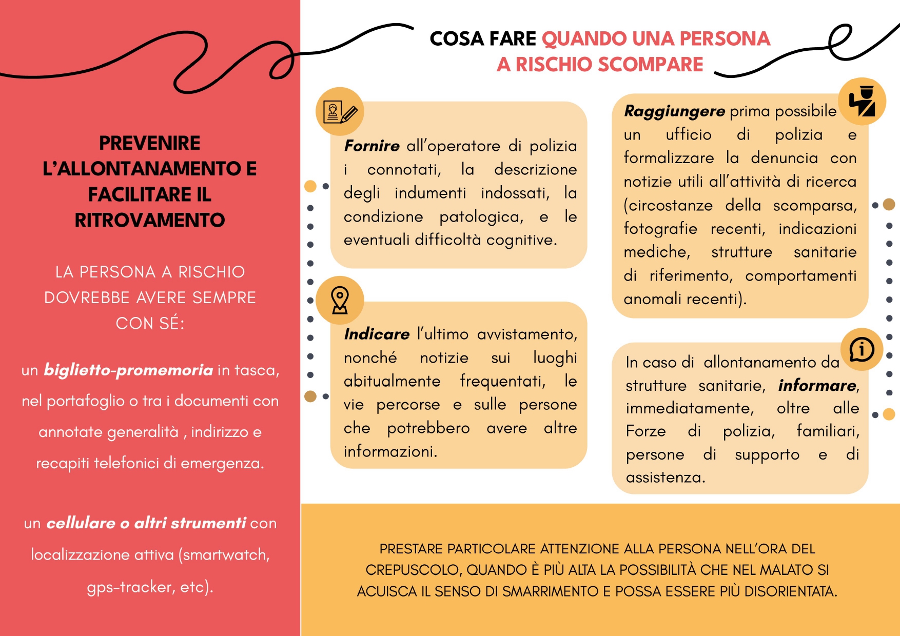 L'ufficio del Commissario per le persone scomparse ha predisposto una brochure esplicativa che fornisce indicazioni sulle iniziative da adottare per prevenire l'allontanamento di persone affette da danno cognitivo e su come agevolarne la ricerca e il ritrovamento in caso di scomparsa.